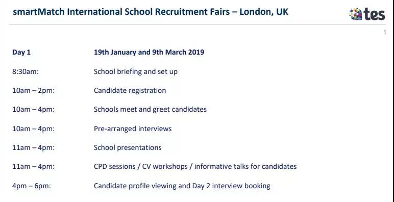 TES的网站平台在国际学校招聘领域影响力很大,但也会定期举办线下招聘会smartMatch Fair。TES每年1-3月在美国、澳洲、英国等有多场招聘会,2018年有超过40所国际学校300多位候选人参加TES伦敦招聘会。
