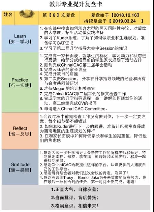另外,学校建立自我评价体系,每周填写工作复盘卡,促进教师不断追求进步、渴望发展。